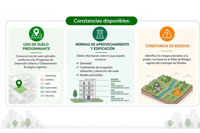 El IMPLAN Morelia pone a tu disposición un conjunto de servicios especializados orientados a brindar información confiable, análisis técnico y acompañamiento en materia de planeación urbana y territorial. A través de herramientas cartográficas, capacitaciones, opiniones técnicas y dictámenes, constancias de uso de suelo apoyamos la toma de decisiones de ciudadanos, profesionistas y autoridades, asegurando el cumplimiento de la normatividad vigente y promoviendo un desarrollo ordenado, sostenible y con visión de largo plazo para la ciudad. Para conocer los costos de estos servicios, consulta la Ley de Ingresos del Municipio de Morelia para el ejercicio fiscal vigente.